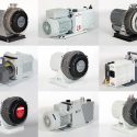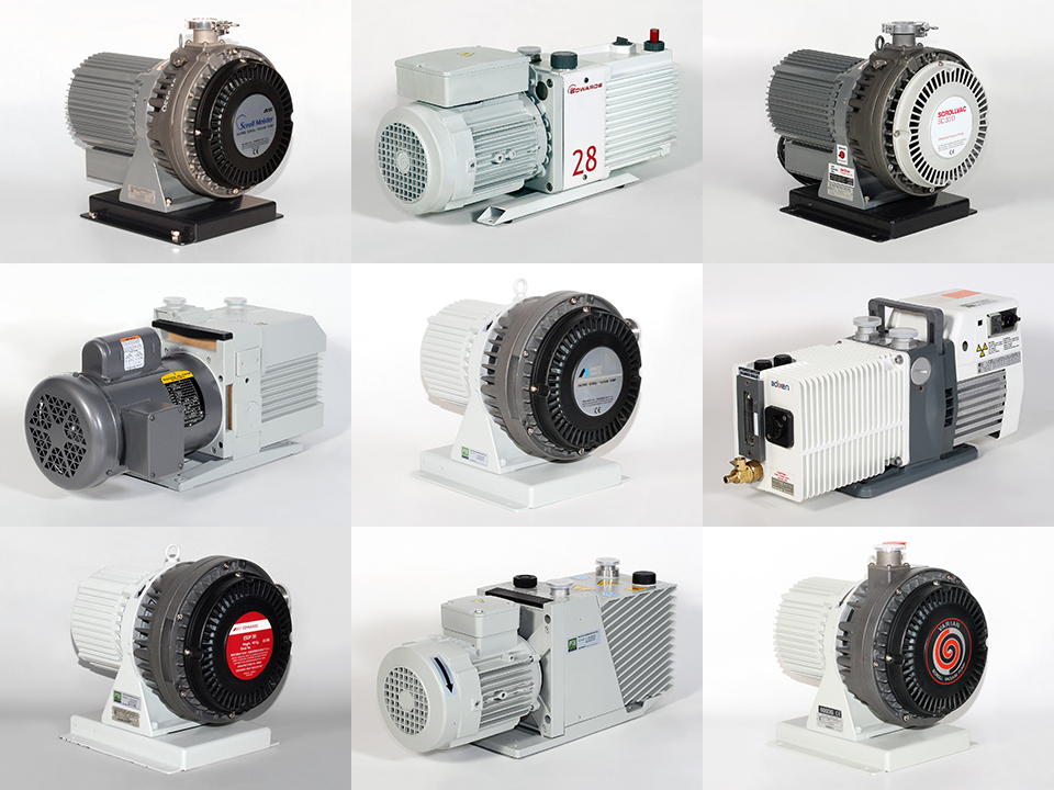 Vane pumps are used for most basic vacuum applications that require high pumping speeds and throughput. Rotary vane pumps use an eccentrically mounted rotor to sweep the gas through an ever-decreasing volume to either another stage or an exhaust. Oil is used as both the lubricant and the sealant. Pumping speeds for a vane pump range from .5 cfm to 300 cfm and the pumps can reach as low as 1 x 10-4 Torr. Rotary vane pumps can be prepared for corrosive and oxygen service.
